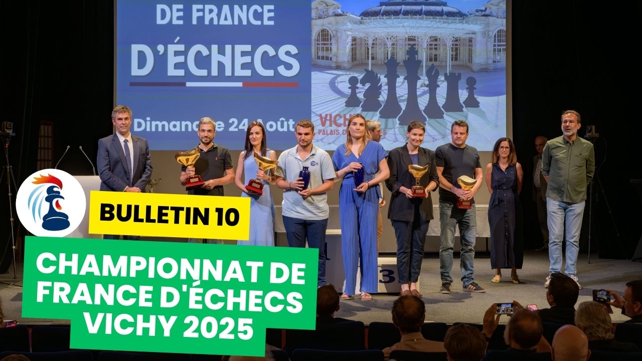Le rideau est tombé sur le Championnat de France d’Échecs 2025 à Vichy : revivez la dernière journée de ce grand événement avec le bulletin vidéo de James Flear. Merci à toutes et tous pour cette superbe édition, et à l’année prochaine !