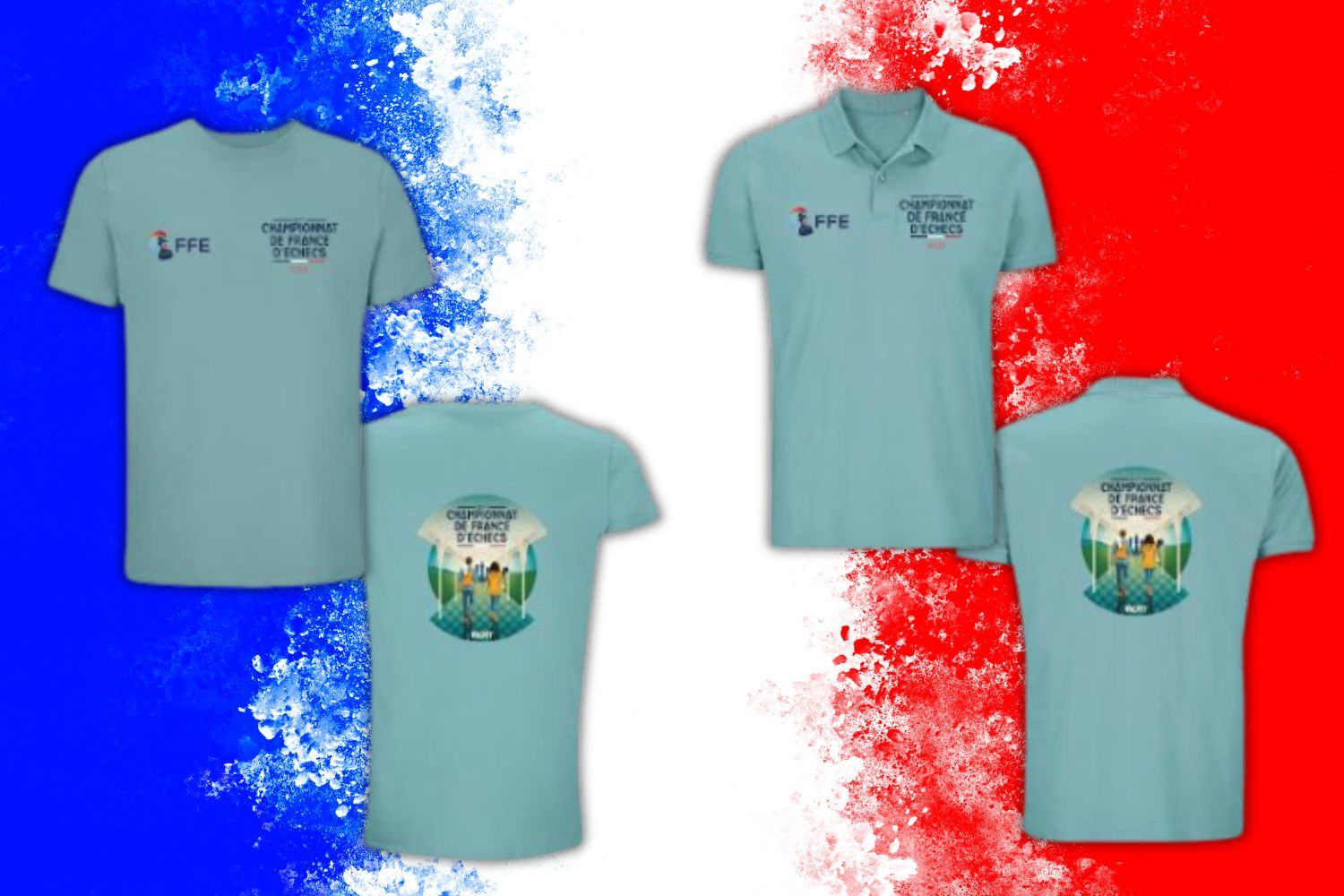 Participer au Championnat de France est une expérience unique, c’est pourquoi nous vous proposons de graver ce souvenir en commandant le T-shirt et le polo officiels, floqués au dos avec l’affiche du tournoi. Avec leur élégante teinte Bleu Piscine estivale, ces vêtements 100% coton en maille piquée vous permettront de garder en mémoire cette grande fête des Échecs. Les précommandes sont ouvertes jusqu’au 23 juillet.